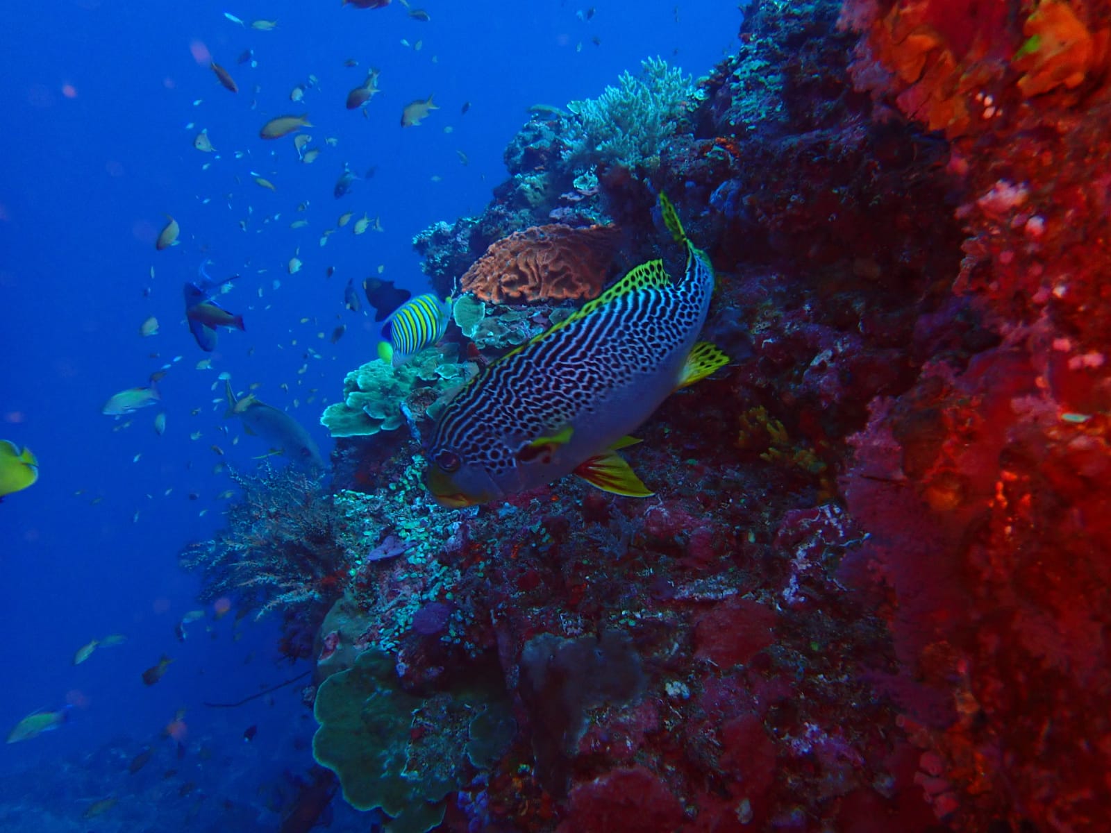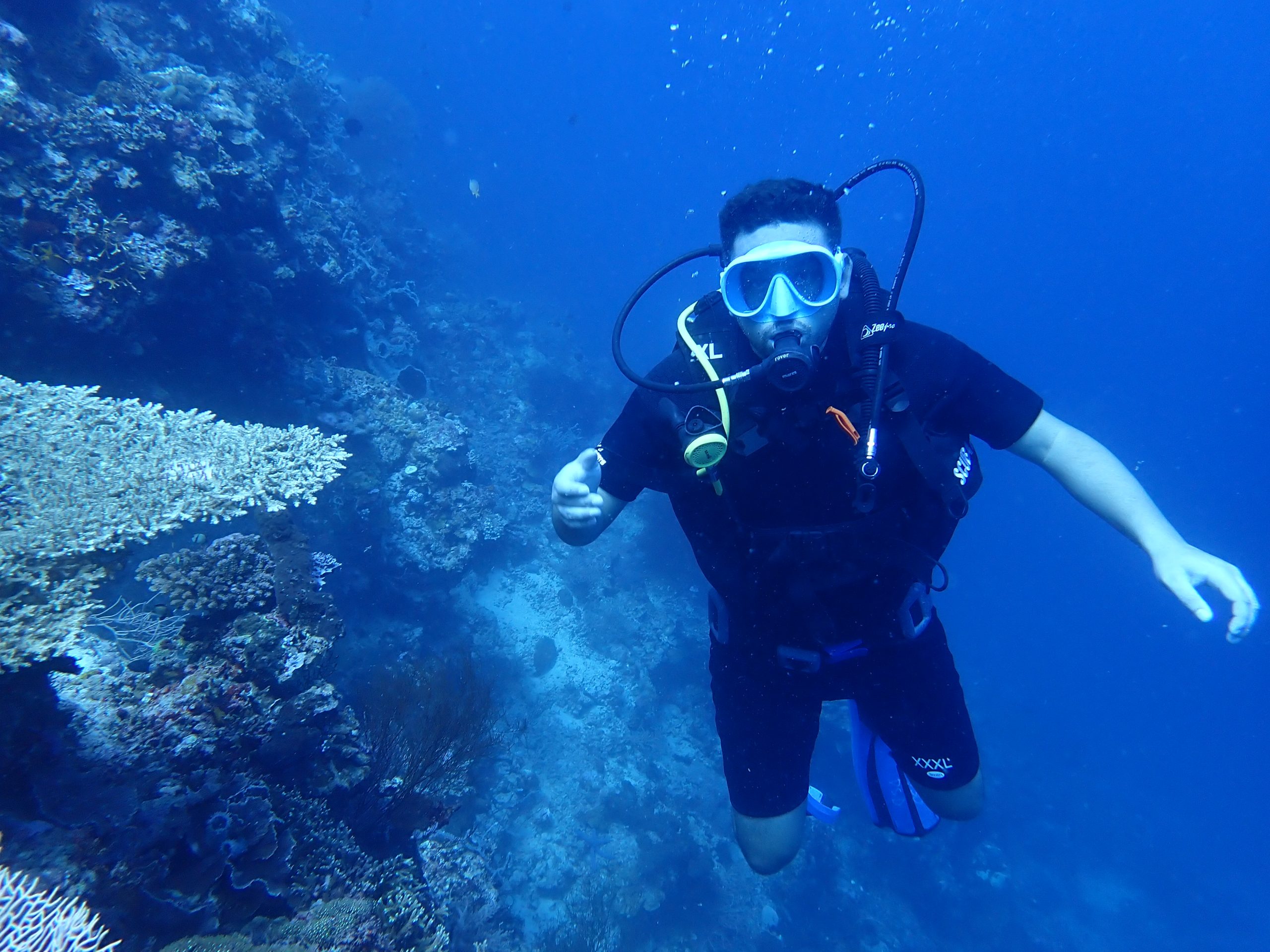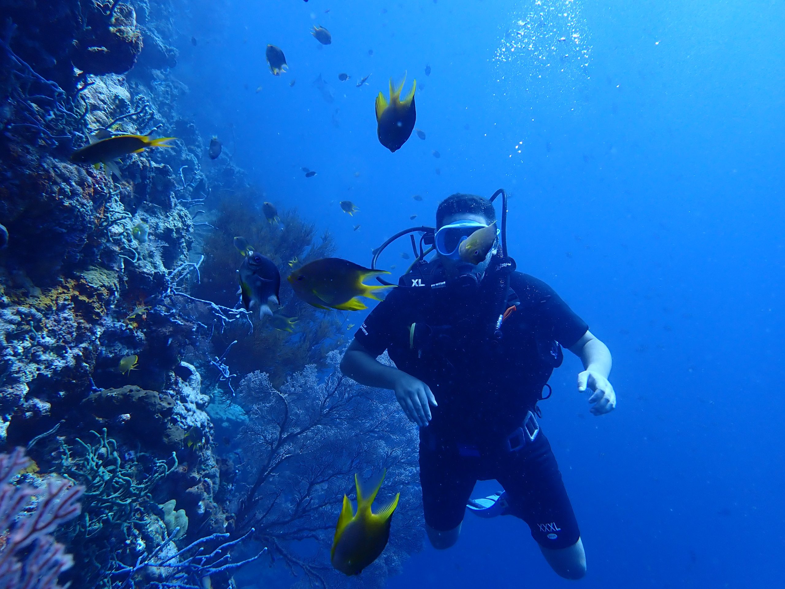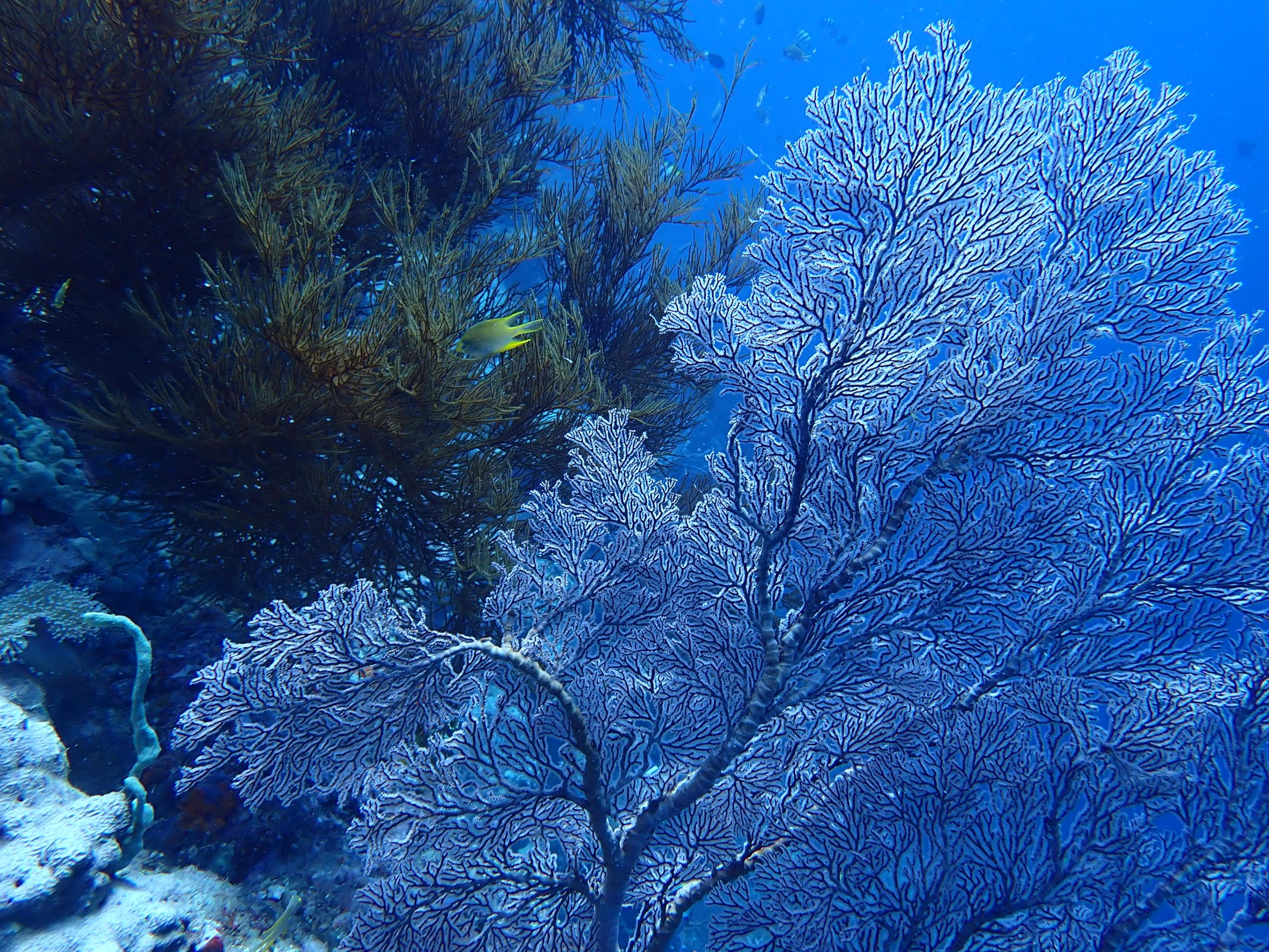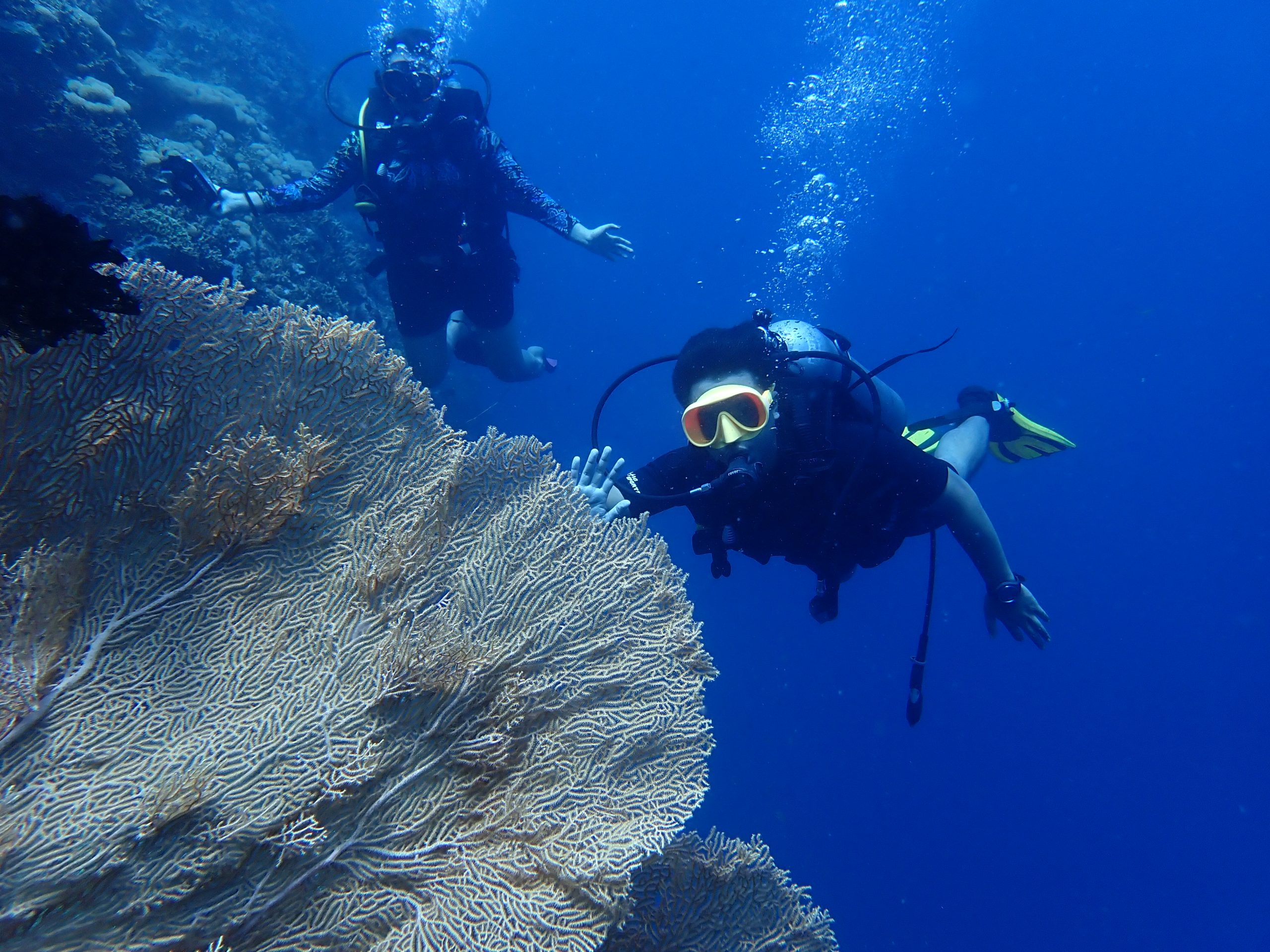 The dive sites feature wall dives (“drop-offs”) starting from 3 meters to 30 meters deep. Currents are usually mild, and visibility is excellent. Explore huge sea fans, turtles, white-tip reef sharks, sweetlips, colorful corals, and abundant fish.